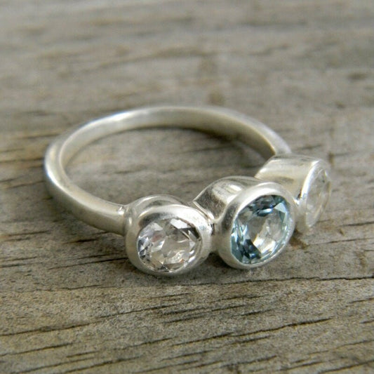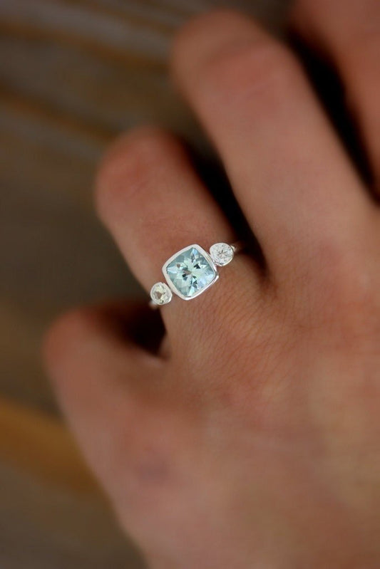 Aquamarine and White Sapphire Cushion Cut Gemstone Ring