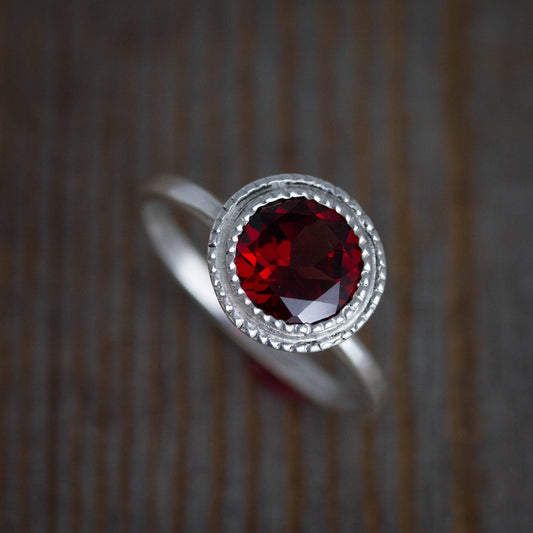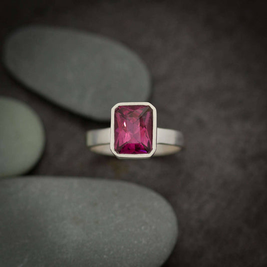 Pink Garnet Ring, Radiant Bezel Solitaire Gemstone Ring in Argentium Silver, Rhodolite Garnet Bezel Set Wide Band Ring