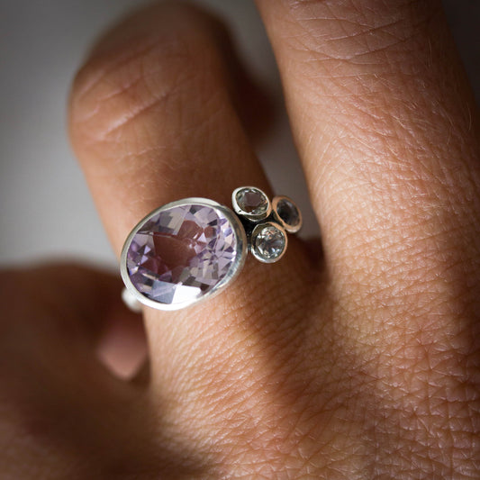 Rose De France Amethyst Ring, White Topaz Ring, Multistone Bezel Gemstone In Silver