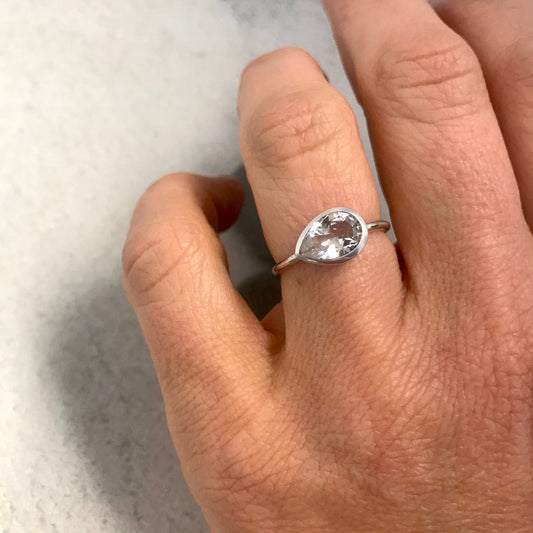 Sideways White Topaz Pear Shape Gemstone Ring, Pear Topaz in Sterling Silver Bezel
