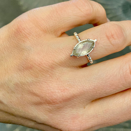 Rutile Quartz and Vintage Sterling Silver Milgrain Band Ring, Diamond Shape Stone Ring, Handmade Marquise Gemstone Prong Setting