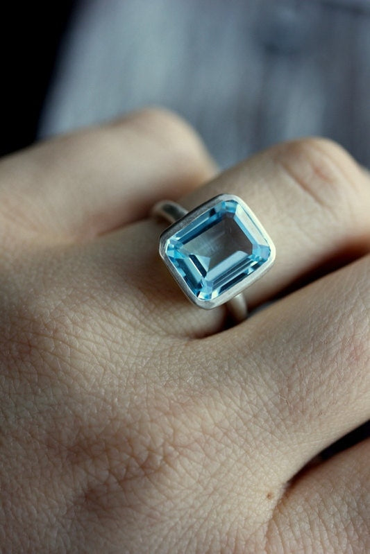 Sky Blue Topaz And Sterling Silver Gemstone Ring, Emerald Octagon Gemstone Stacking Solitaire Ring, All Sizes