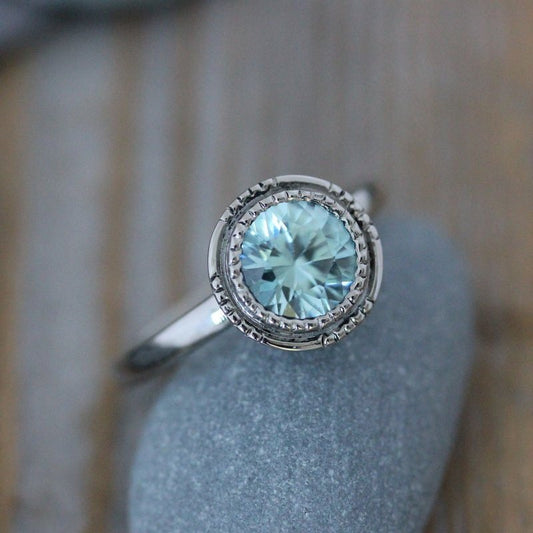 March Birthstone Ring, Cushion Aquamarine Ring Blue Gemstone Bezel Set Engagement Ring